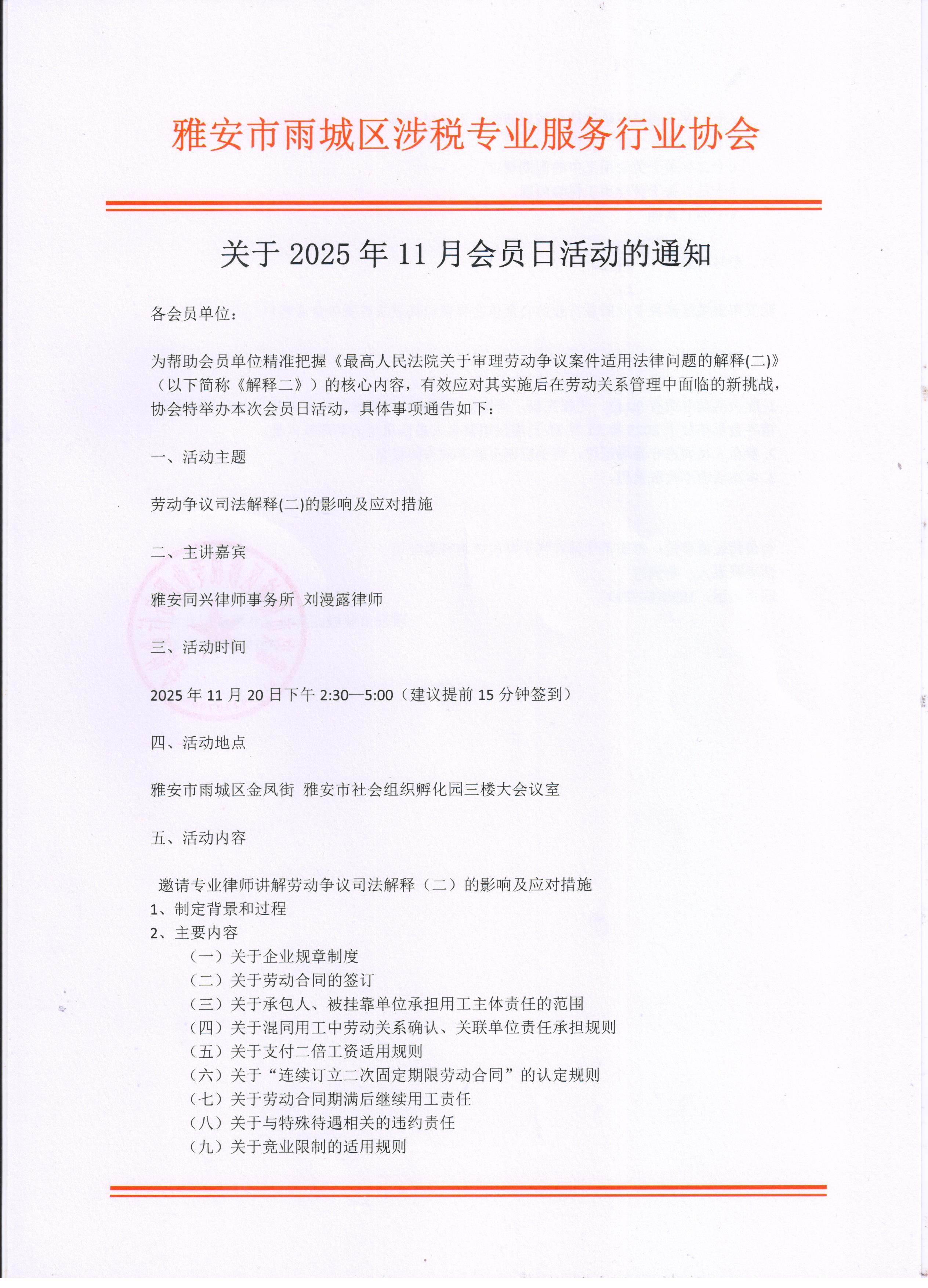 为帮助会员单位精准把握《最高人民法院关于审理劳动争议案件适用法律问题的解释(二)》(以下简称《解释二》)的核心内容,有效应对其实施后在劳动关系管理中面临的新挑战,协会特举办本次会员日活动,具体事项通告如下: