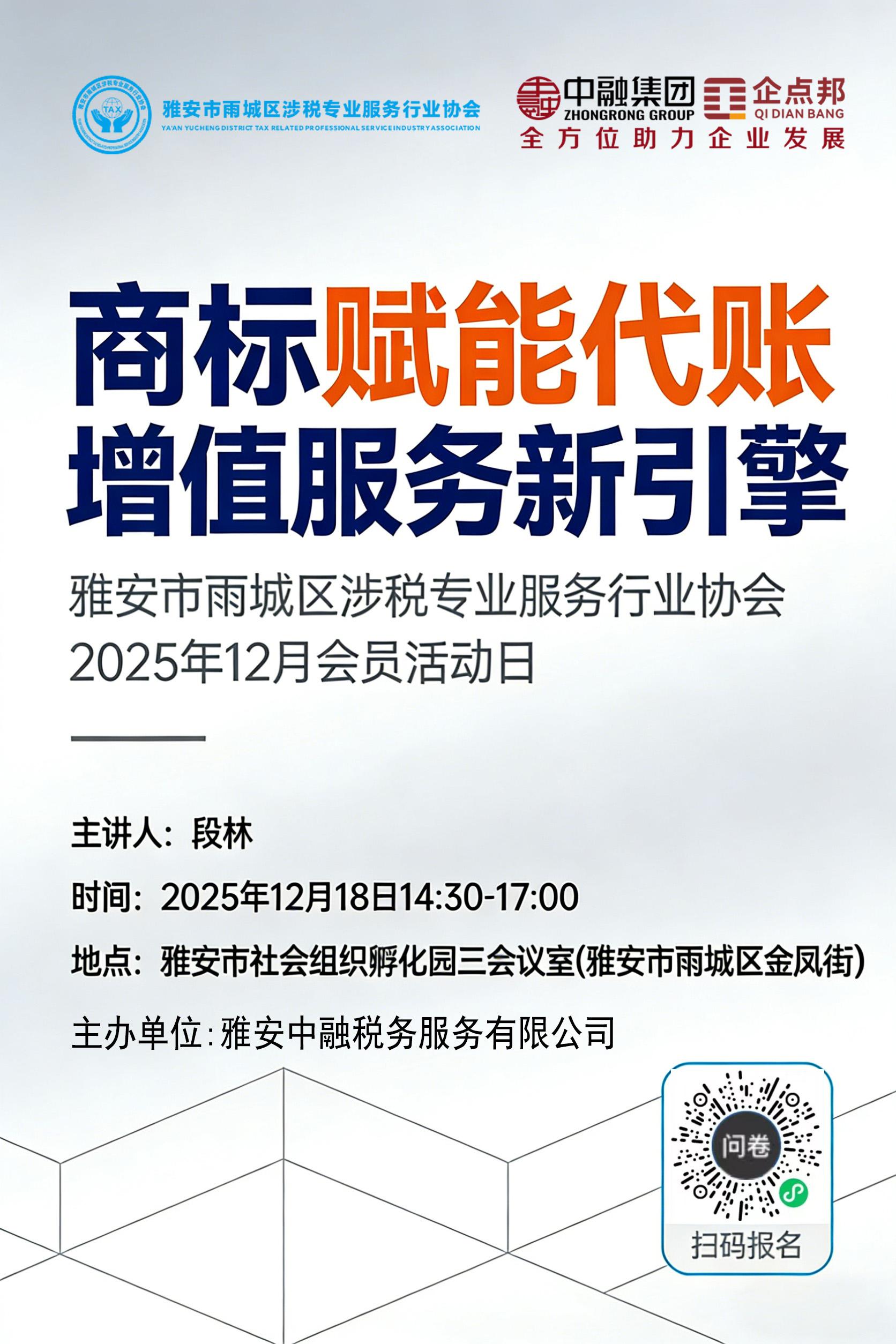 为帮助会员单位拓展代账服务增值空间,协会定于 2025 年 12 月举办 “商标赋能代账 增值服务新引擎” 主题活动日,具体安排如下: